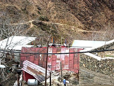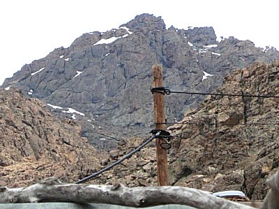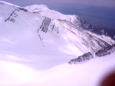 2100メートルの地点から上方の山々を望むと、雪を被った峰から更に上方の峰に登る